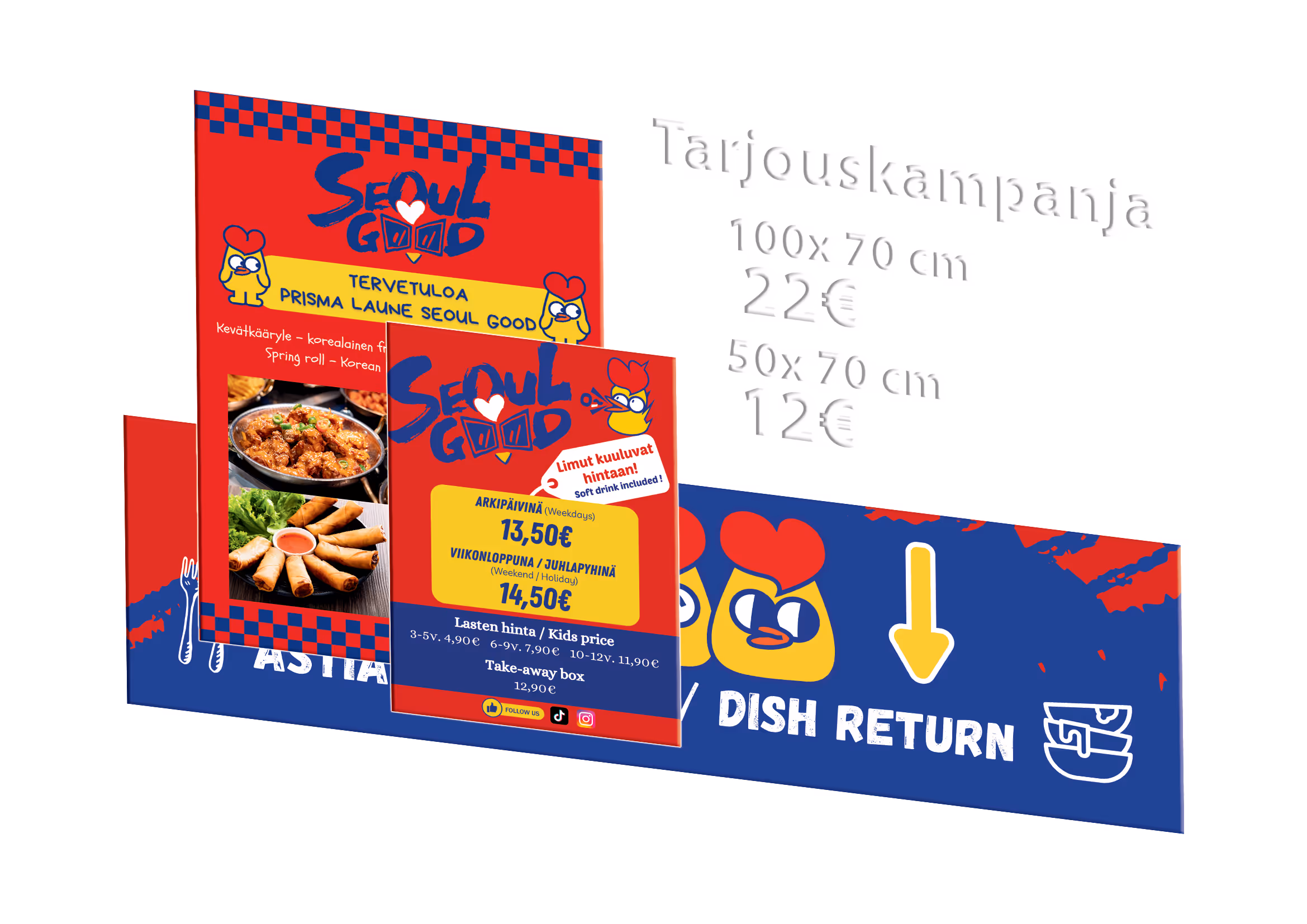 Valmistamme 50 × 70 cm ja 100 × 70 cm mainosjulisteita, jotka on suunniteltu kestämään ulkokäyttöä. Julisteet tulostetaan UV-tulostuksella, ei vesipohjaisilla musteilla. UV-tulostus tekee väreistä kirkkaammat, pinnasta kestävämmän ja julisteista sään- sekä kosteuden kestävät.